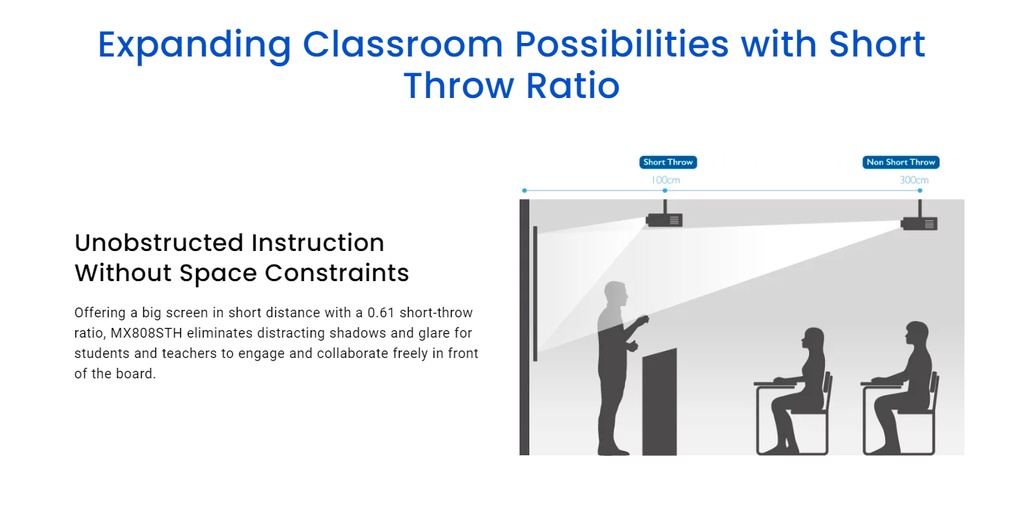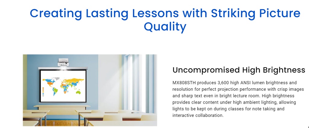 MX808STH education projector enhances interactive learning and classroom collaboration with outstanding picture quality, high brightness, and short throw capability. Smart installation flexibility combined with reduced maintenance and ownership costs make MX808STH the ideal choice for today's schools.